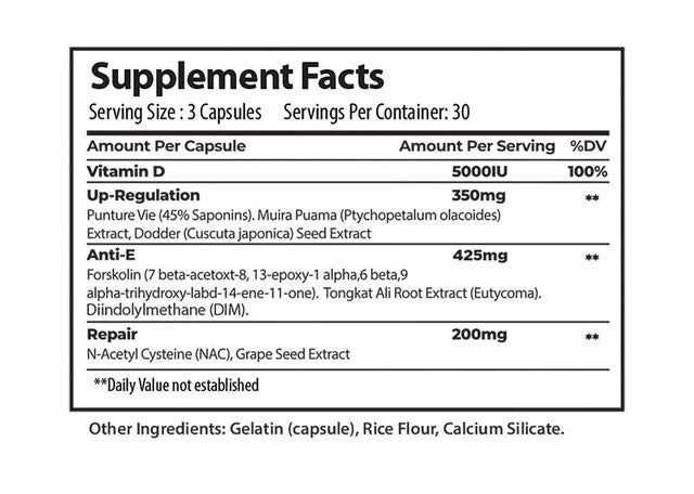 The Up-Regulation complex offers an innovative approach to restoring hormonal balance post-cycle. Key ingredients such as Muira Puama, Dodder Seed Extract, and Punture Vie (standardized to 45% saponins) work synergistically to stimulate natural testosterone production. Saponins in Punture Vie have proven adaptogenic properties, helping the body manage oxidative and hormonal stress. Muira Puama, known as the "potency wood," is a traditional aphrodisiac supporting libido and sexual function, often compromised post-cycle. Dodder Seed Extract acts as an antioxidant, supporting reproductive health. The Up-Regulation complex makes post-cycle recovery more efficient and helps the body return to balance faster.