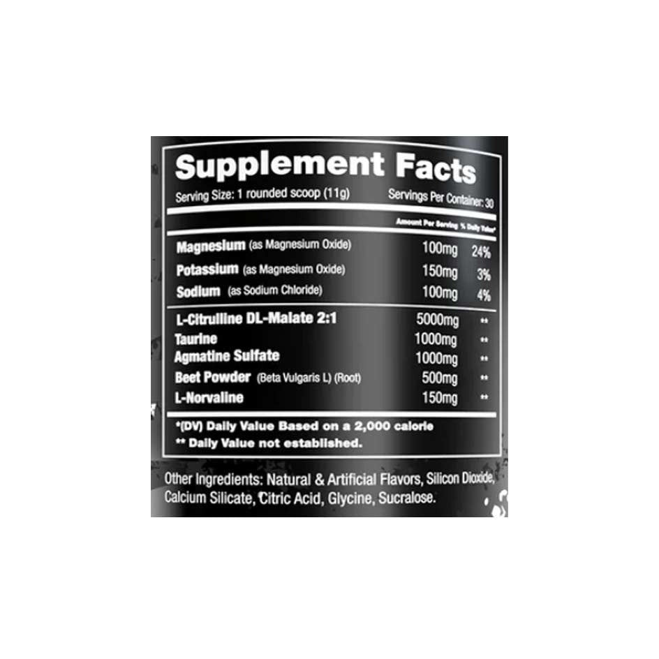 L-Citrulline DL-Malate 2:1 (5000 mg). Converts to arginine to boost nitric oxide production, enhancing pumps, reducing fatigue, and improving training volume and endurance. Taurine (1000 mg). Regulates muscle contractions and hydration, enhances cell volume for better pumps, and protects muscle fibers from oxidative stress. Agmatine Sulfate (1000 mg). Increases nitric oxide production and protein synthesis, while acting as a neurotransmitter to improve mood and training focus. Beetroot Powder (500 mg). A rich source of nitrates that convert to nitric oxide, enhancing blood flow, endurance, and reducing fatigue while providing antioxidant support. L-Norvaline (150 mg). Inhibits arginase to maintain elevated arginine levels, extending nitric oxide production for sustained muscle pumps and vascularity. Magnesium (as Magnesium Oxide) (100 mg). Supports muscle contraction, prevents cramps, and aids protein synthesis and energy metabolism during training. Potassium (as Potassium Oxide) (150 mg). Maintains electrolyte balance, improves muscle contraction efficiency, and optimizes hydration for stronger workouts. Sodium (as Sodium Chloride) (100 mg). Essential for fluid balance and muscle hydration, supporting optimal function during intense physical exertion.