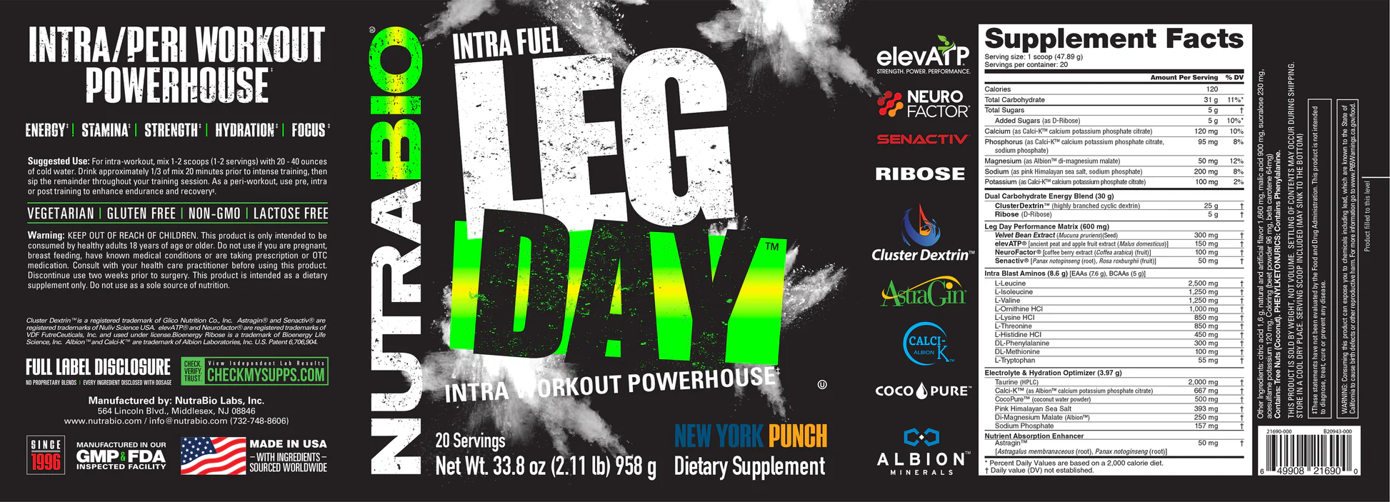 LEG DAY is a special edition of our top-selling intra-workout supplement, Intra Blast. LEG DAY takes Intra Blast to new heights and beefs it up to further improve your workout performance for those killer workouts where you leave everything in the gym. Those workouts where you question if you even want to attempt walking out to your car. In those workouts, you don’t want to hit the wall, you don’t want to throw in the towel, you want to annihilate your muscles and force new growth. NutraBio LEG DAY can help you do just that.