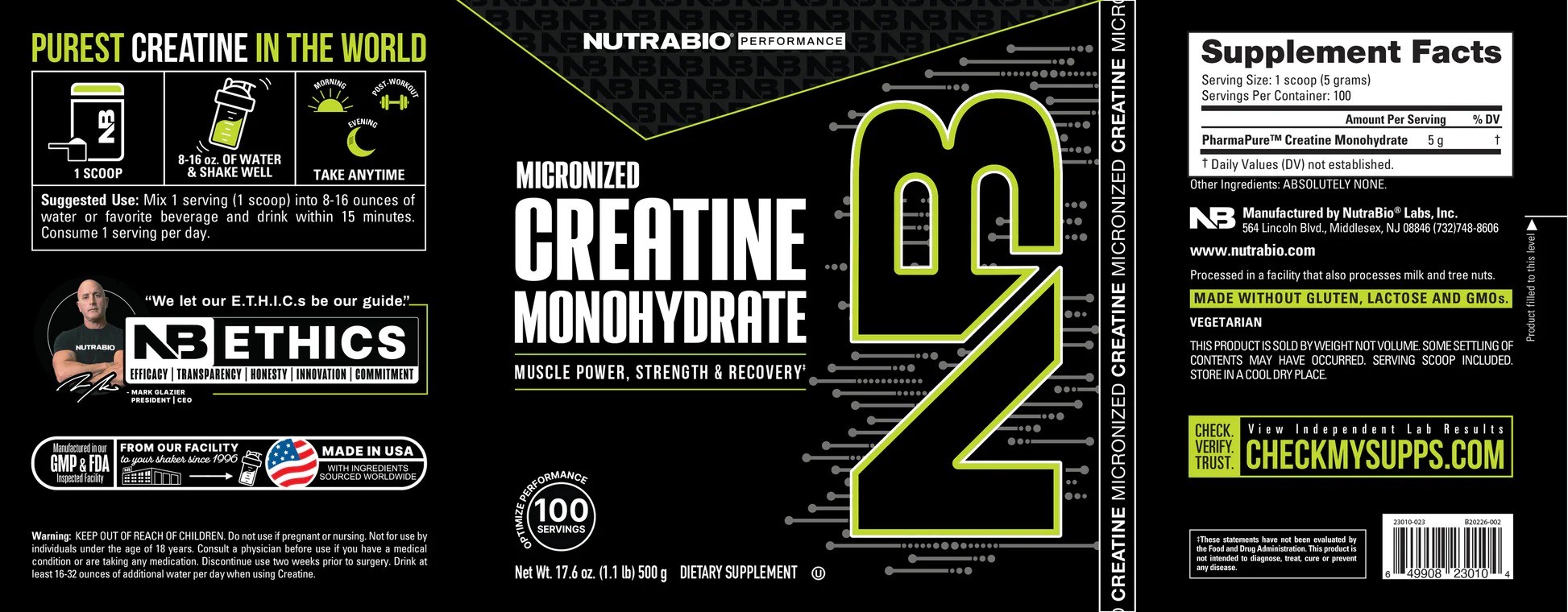 Since 1996, NutraBio has sold only the purest supplements. NutraBio Creatine Monohydrate is a dietary supplement that meets high purity and certification standards, making it a trusted choice for athletes. Every batch is tested to be at least 99.98% pure, or we won't ship it to you; that's our quality commitment. We manufacture here in the United States to meet FDA 21 CFR Part 111 CGMP regulations, and all ingredients undergo state-of-the-art analysis to ensure zero tolerance for impurities. We ship our products direct to you, which guarantees the freshness, and our creatine is available as a micronized powder for improved mixability and absorption.